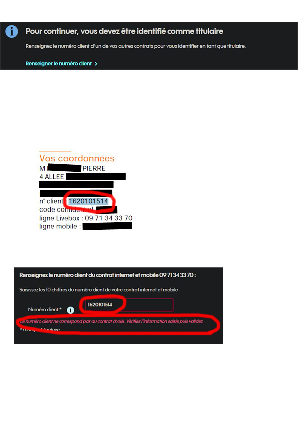 Pour résilier mon offre (car je ne suis pas satisfait, et ça continue), on me demande de "vérifier mon identité" en entrant mon numéro de client d'un autre contrat, en l'occurence un contrat internet et mobile que j'avais auparavant chez Orange. Bien évidemment cela ne fonctionne pas et on m'indique que le numéro client que je saisis ne correspond pas au contrat choisi. Or c'est bien ce numéro qui apparait sur mes factures. Je n'en ai pas d'autre. J'ai gardé le même numéro client entre Orange et mon passage chez Sosh. J'attends une réponse claire de votre part, merci. Pour plus d'infos merci de consulter les captures d'écran ici : https://www.zupimages.net/up/20/05/uhko.png