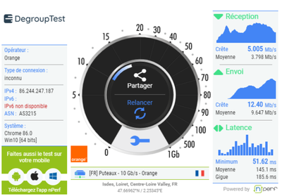 Pourtant la box indique une connexion VDSL avec une capacité de 64Mb/s decendant et 20Mb/s montant, et j'avais l'habitude d'un ping autour de 12ms.