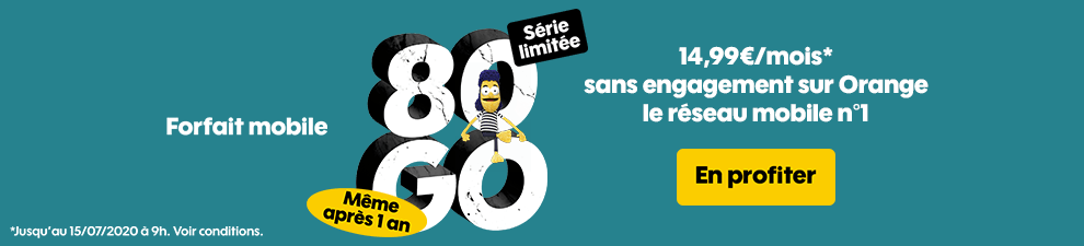Offre valable en France métropolitaine pour toute nouvelle souscription d'une Série Limitée Sosh mobile 14,99€ 80Go jusqu’au 15/07/2020 9h. Offre non valable pour les clients mobile Orange ou Sosh en changement d’offre. Conditions sur sosh.fr