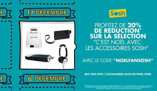 Sosh a pensé à vous pour Noël ! 20%* de remise sur la sélection d’accessoires de Noël avec le code promo "noelfansosh" ! Rdv du 17 au 24 décembre sur la boutique accessoires Sosh. A très b...